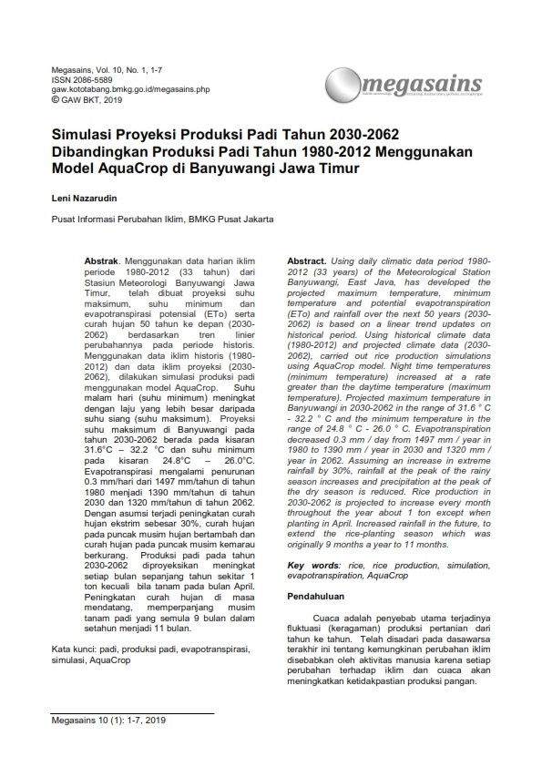 Using daily climatic data period 1980- 2012 (33 years) of the Meteorological Station Banyuwangi, East Java, has developed the projected maximum temperature, minimum temperature and potential evapotranspiration (ETo) and rainfall over the next 50 years (2030- 2062) is based on a linear trend updates on historical period. Using historical climate data (1980-2012) and projected climate data (2030- 2062), carried out rice production simulations using AquaCrop model. Night time temperatures (minimum temperature) increased at a rate greater than the daytime temperature (maximum temperature). Projected maximum temperature in Banyuwangi in 2030-2062 in the range of 31.6 ° C - 32.2 ° C and the minimum temperature in the range of 24.8 ° C - 26.0 ° C. Evapotranspiration decreased 0.3 mm / day from 1497 mm / year in 1980 to 1390 mm / year in 2030 and 1320 mm / year in 2062. Assuming an increase in extreme rainfall by 30%, rainfall at the peak of the rainy season increases and precipitation at the peak of the dry season is reduced. Rice production in 2030-2062 is projected to increase every month throughout the year about 1 ton except when planting in April. Increased rainfall in the future, to extend the rice-planting season which was originally 9 months a year to 11 months