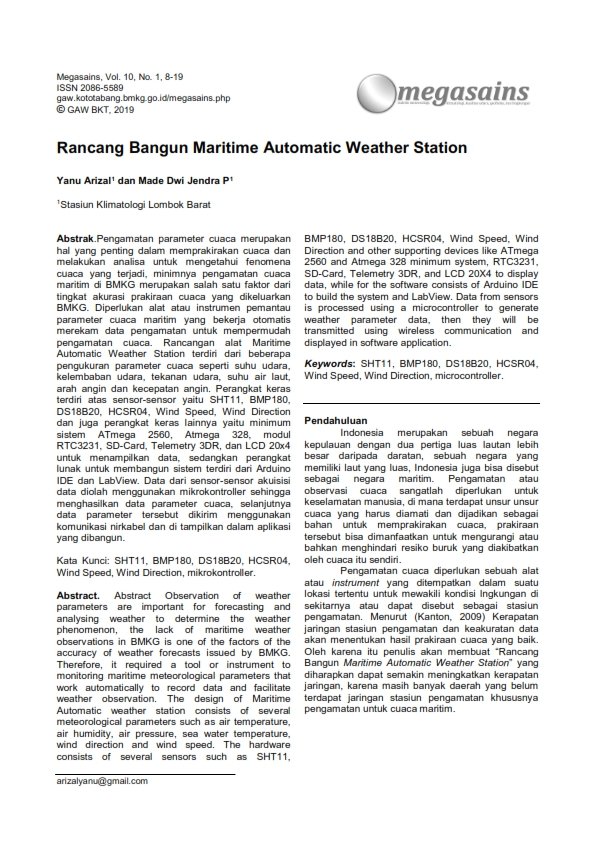 Abstract Observation of weather parameters are important for forecasting and analysing weather to determine the weather phenomenon, the lack of maritime weather observations in BMKG is one of the factors of the accuracy of weather forecasts issued by BMKG. Therefore, it required a tool or instrument to monitoring maritime meteorological parameters that work automatically to record data and facilitate weather observation. The design of Maritime Automatic weather station consists of several meteorological parameters such as air temperature, air humidity, air pressure, sea water temperature, wind direction and wind speed. The hardware consists of several sensors such as SHT11, BMP180, DS18B20, HCSR04, Wind Speed, Wind Direction and other supporting devices like ATmega 2560 and Atmega 328 minimum system, RTC3231, SD-Card, Telemetry 3DR, and LCD 20X4 to display data, while for the software consists of Arduino IDE to build the system and LabView. Data from sensors is processed using a microcontroller to generate weather parameter data, then they will be transmitted using wireless communication and displayed in software application