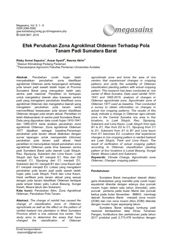 The change of rainfall has caused the change of classification zone of Oldeman agroclimate as well as the effect on the pattern of rainfed lowland rice plantation in West Sumatera Province which is one national rice center. This study aims to determine the areas that have changed     the     classification     of     Oldeman agroclimate  zone  and  know  the  area  of  rice centers that experienced changes in cropping patterns and verify the suitability of Oldeman classification planting pattern with actual cropping pattern. This research has been conducted at  rice center of West Sumatra. Data used rainfall 1910- 1941 and 1985-2015, analysis of changes in Oldeman agroclimate zone. Agroclimatic zone of Oldeman 1977 used as baseline. Then conducted a  survey  to  obtain  information  on  changes  in actual rice cropping patterns. The results of this study indicate a change in Oldeman agro-climatic zone in the Central Sumatra rice area in five locations, in Luak Situjuh, Rao, Sijunjung, Sukarami and Lima Kaum. Luak Situjuh from type B1 to E1, Rao from D2 to C1, Sijunjung from C1 to D1, Sukarami from A1 to B1 and Lima kaum from E1 becomes E3. Locations that experience changes in rice cropping pattern in rainfed lowland are  Luak  Situjuh,  Panti  and  Lima  Kaum.  The result of verification of actual cropping pattern according to Oldeman classification planting pattern at four locations is Lubuk Basung, Sungai Dareh, Muara Labuh and Sukarami.
