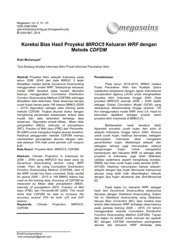 Climate Projection in Indonesia for 2006 – 2040 using MIROC5 has been done by Dynamical Downscaling technic using WRF model. Then, By using Cumulative Disrtribution Function Downscaling Method (CDFDM), bias of the WRF model has been corrected. Daily rainfall for period 2006 – 2015 in 148 BMKG station has used as the training data. Accuracy of CDFDM be measured by Mean daily precipitation (MEA), Intensity of precipitation (INT), Fraction of Wet days (FRE) dan Percentile-90 (Q90). The result show that CDFDM be able to increase the accuracy around 15% for both JJA and DJF season