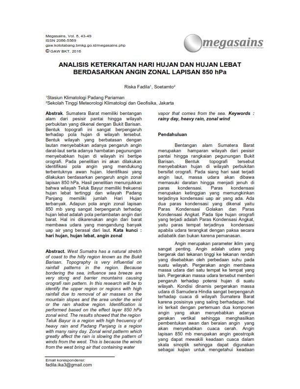 Abstract. West Sumatra has a natural stretch of coast to the hilly region known as the Bukit Barisan. Topography is very influential on rainfall patterns in the region. Because bordering the sea, influence sea breeze are very stong and barrier mountains causing orografi rain pattern. In this research will be to identify the upper region or regions with high rainfall due to removal of air masses on the mountain slopes and the area under the wind or the rain shadow region. Identification is performed based on the effect layer 850 hPa zonal wind. The results showed that the region Teluk Bayur is a region with high frecuency of heavy rain and Padang Panjang is a region with many rainy day. Zonal wind patterrn which greatly affect the rain is slowing the pattern of winds from the west. This is because the winds from the west bring air that containing water vapor that comes from the sea